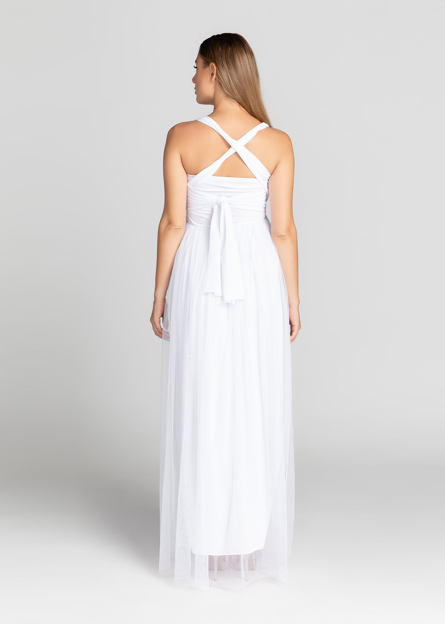 Elegant, convertible, and less complicated. Be at your best in multiple looks. The attached tube top allows more room for creativity and the tulle overlay creates soft maxi drape perfect for your special day.